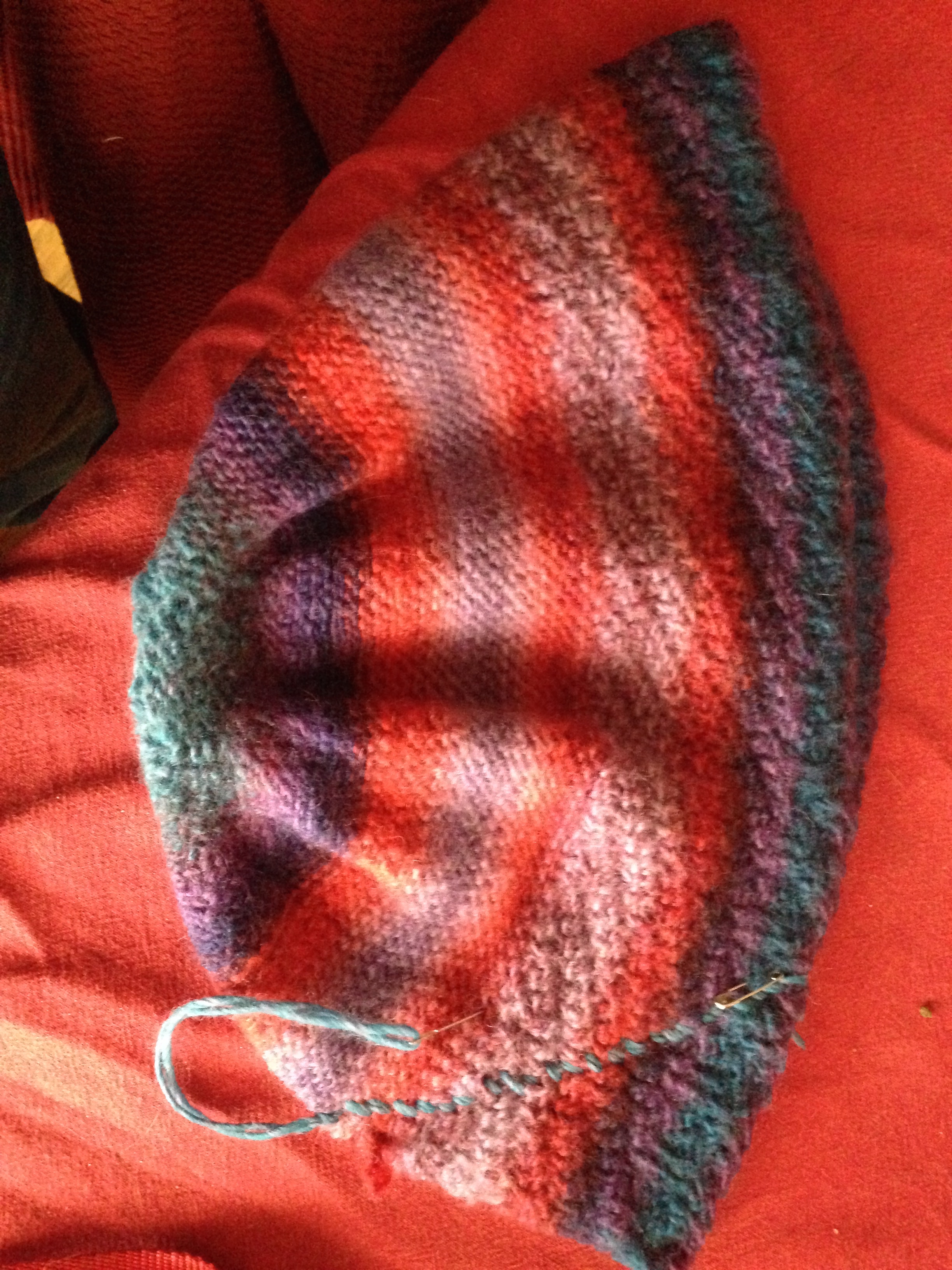 Meanwhile, I still had a fuzzy floppy fruit bowl. I thought, I give up. I can’t frog it now, because it’s about 50% felted. I tried wearing it, and it flopped and any breeze threatened to blow it off my noggin. Finally, I folded up part of it and pinned it with a safety pin to make it fit more snugly.